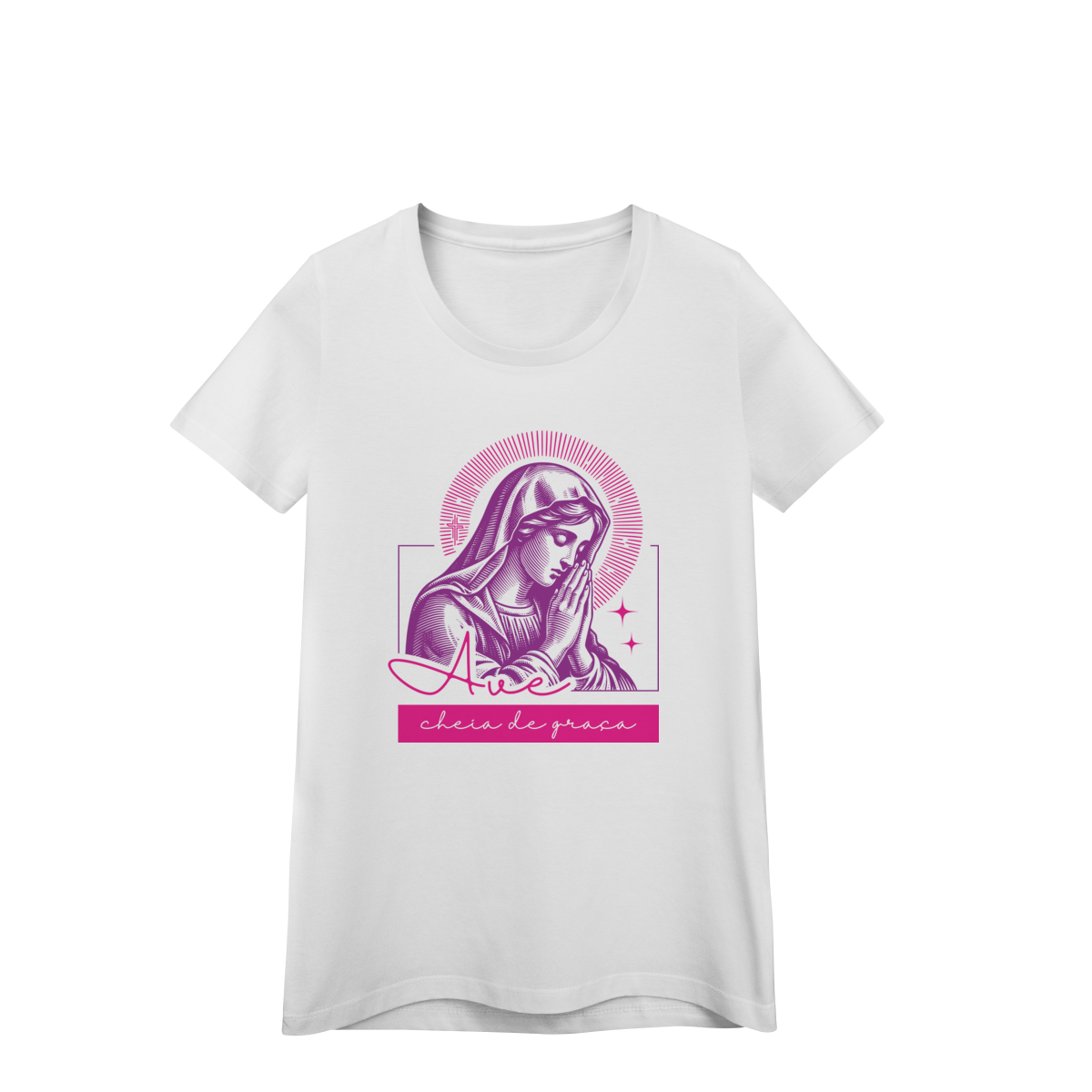 Uma peça que une fé e estilo em um design marcante. A estampa traz a imagem clássica de Maria em oração, acompanhada da frase "Ave cheia de graça", transmitindo espiritualidade e devoção com um toque moderno.