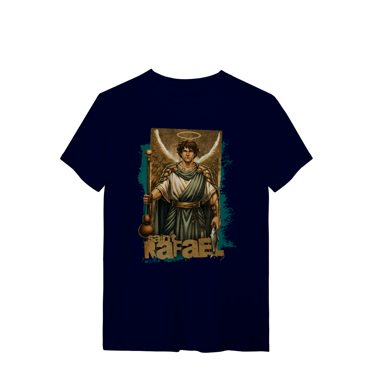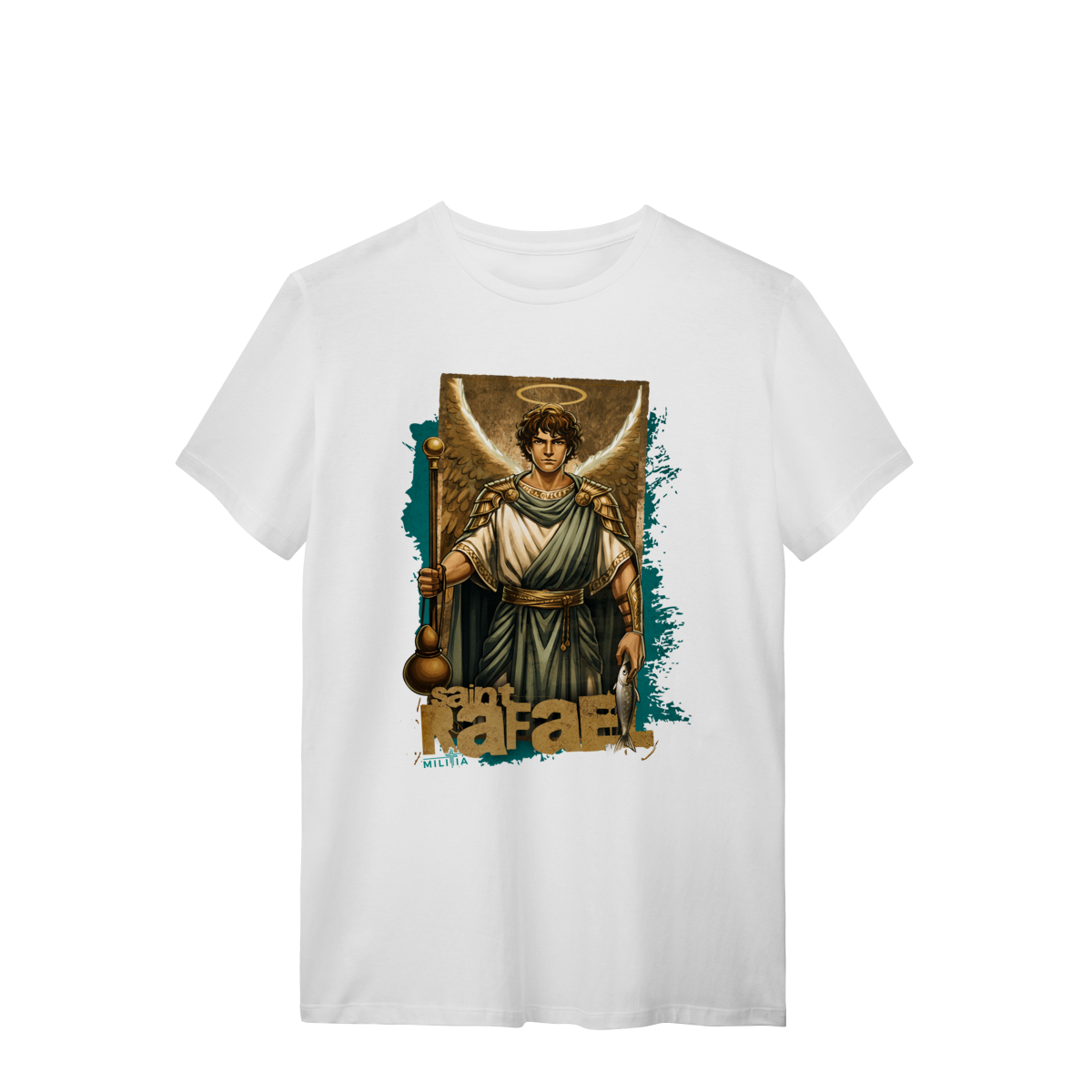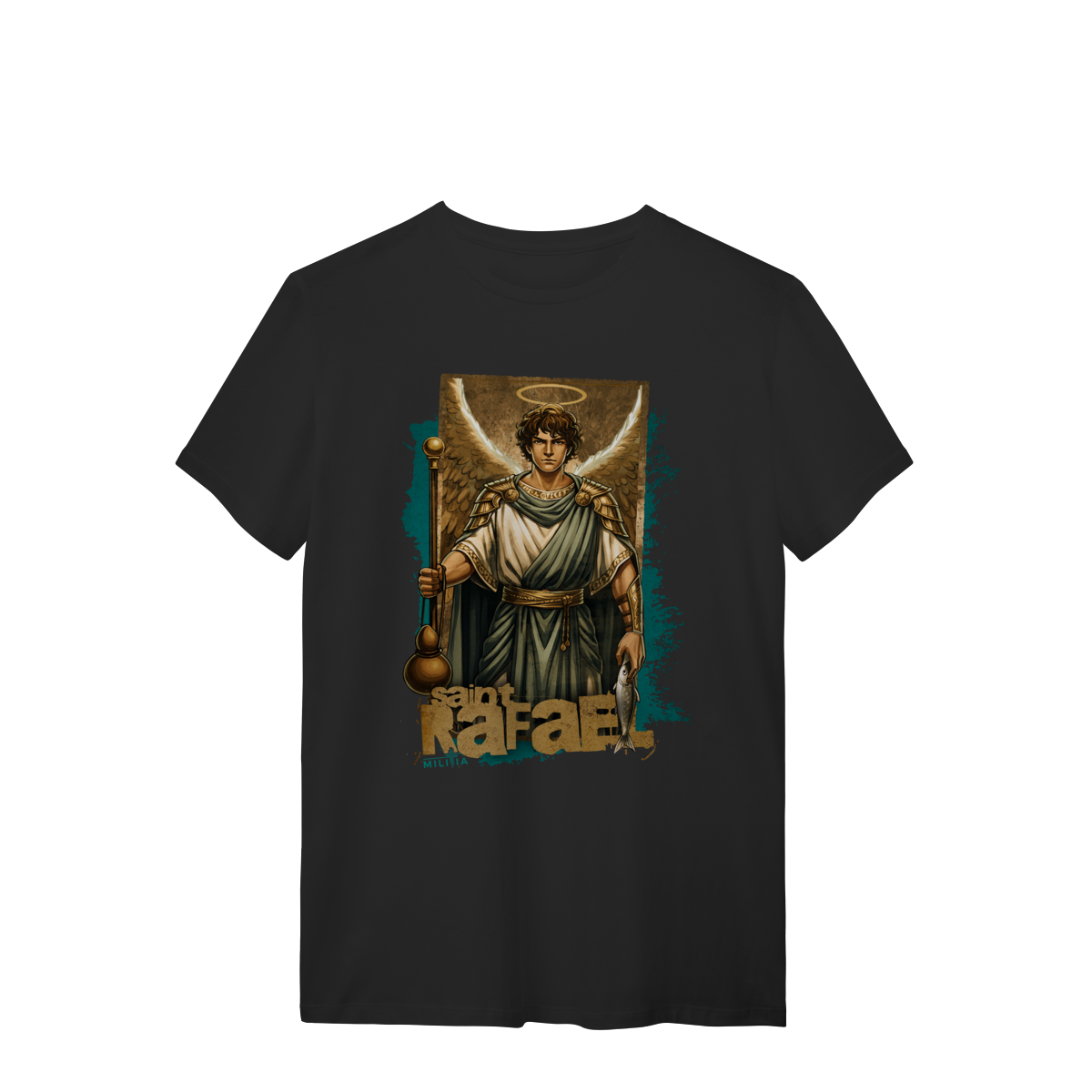 Em uma das mãos, Rafael segura o cajado e a cabaça – símbolos de sua missão como protetor nas jornadas, lembrando a peregrinação de Tobias, a quem acompanhou fielmente. Na outra mão, carrega o peixe, elemento central da narrativa do Livro de Tobias, usado como instrumento divino para a cura e libertação.