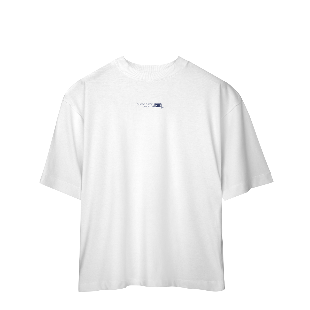 Na frente, a estampa sutil traz a frase “Quero estar unido a Jesus”, um lembrete de intimidade com Cristo.