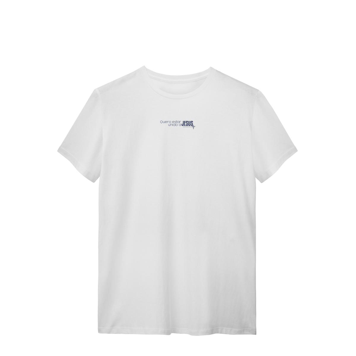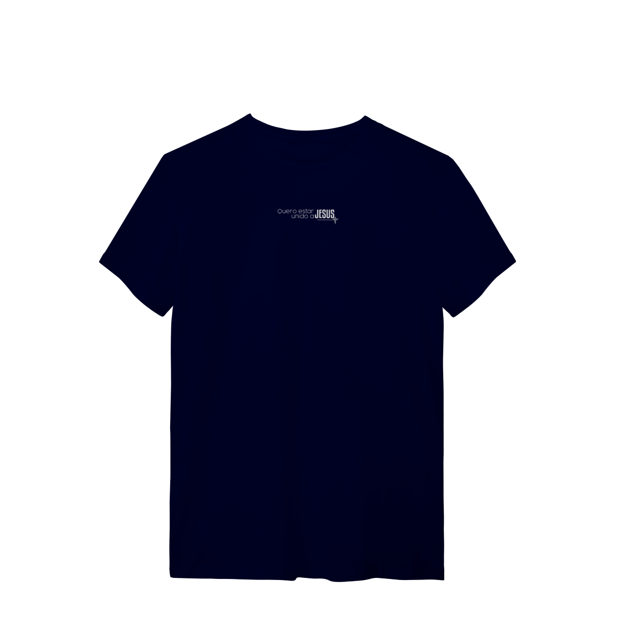 Na frente, a estampa sutil traz a frase “Quero estar unido a Jesus”, um lembrete de intimidade com Cristo.
