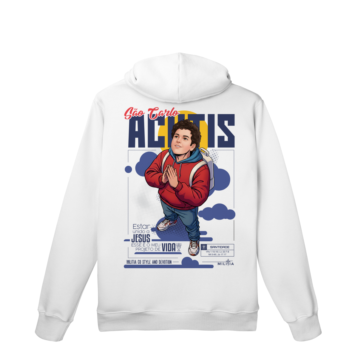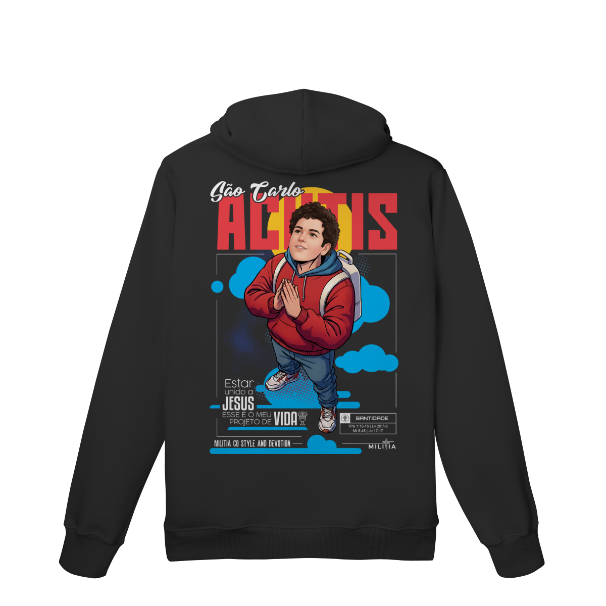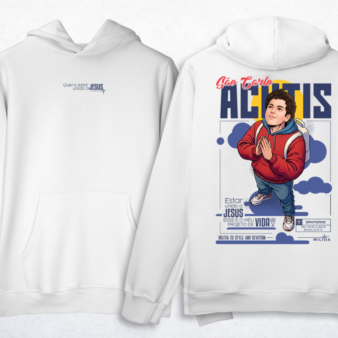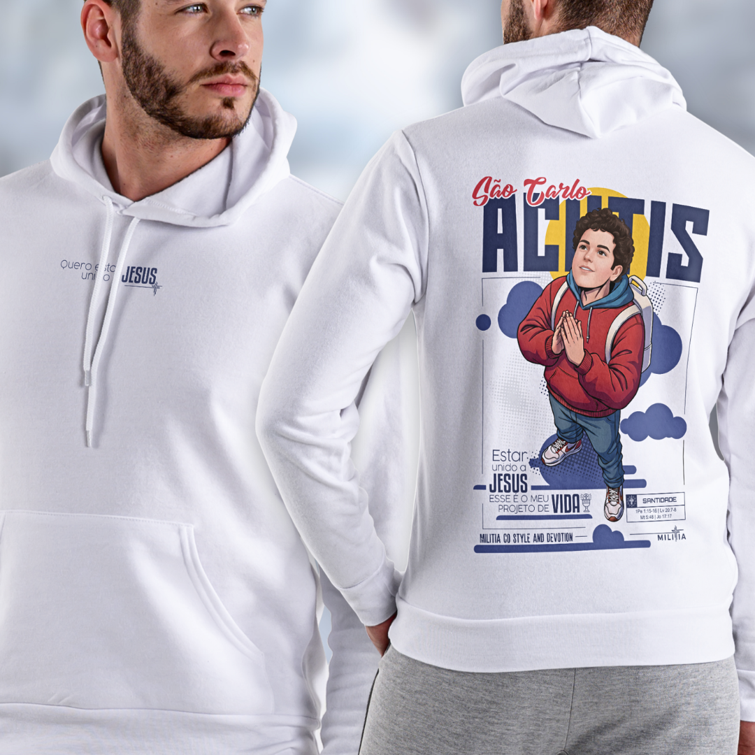 O Moletom Projeto de Vida é uma peça que une fé, estilo e propósito. Inspirado em Carlo Acutis, o jovem Santo conhecido por sua profunda devoção e proximidade com os jovens, o design traz uma mensagem que ultrapassa o tempo: ser santo é para todos, aqui e agora.