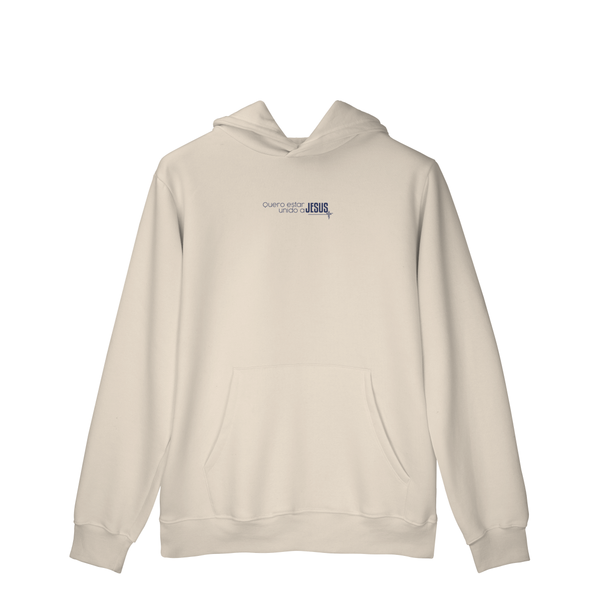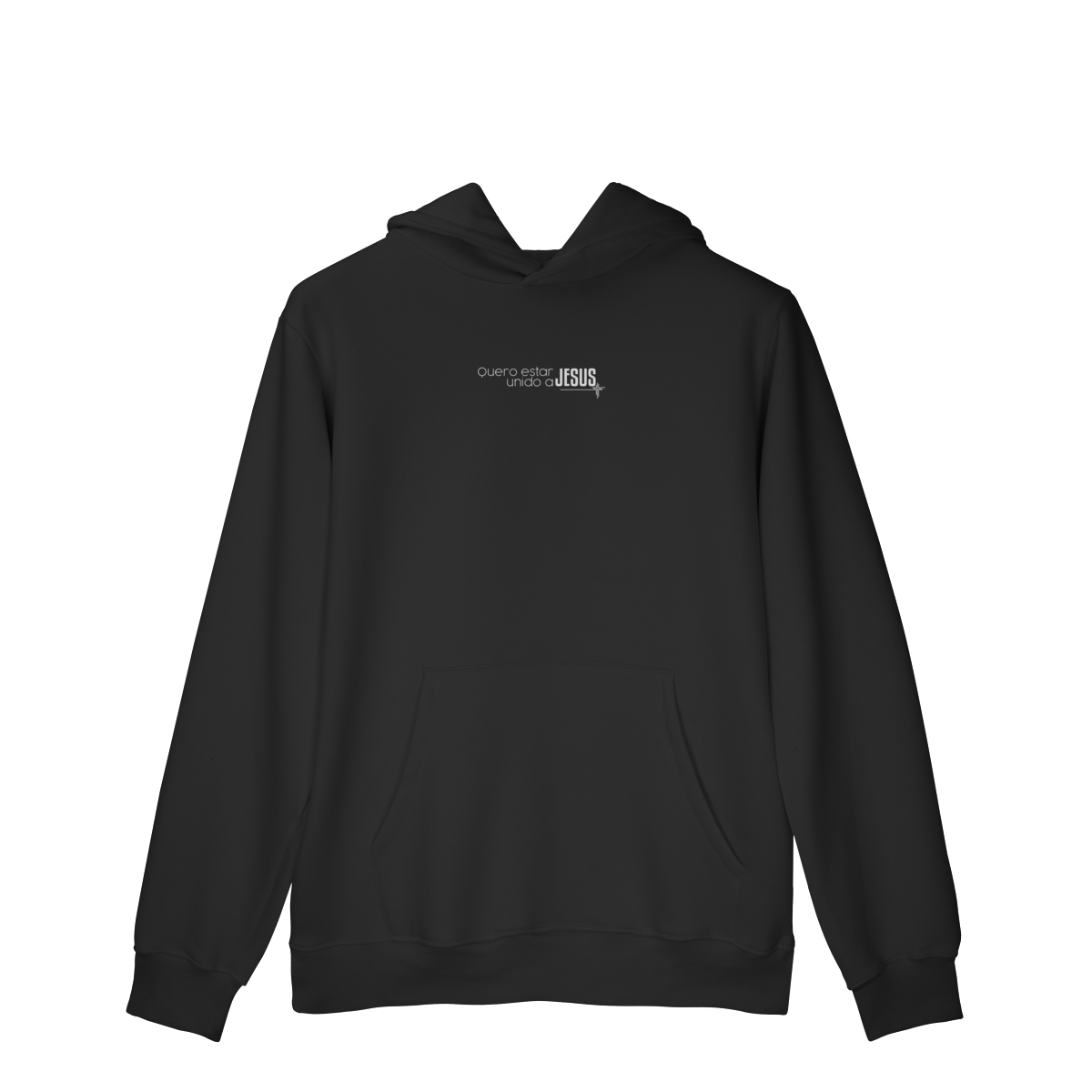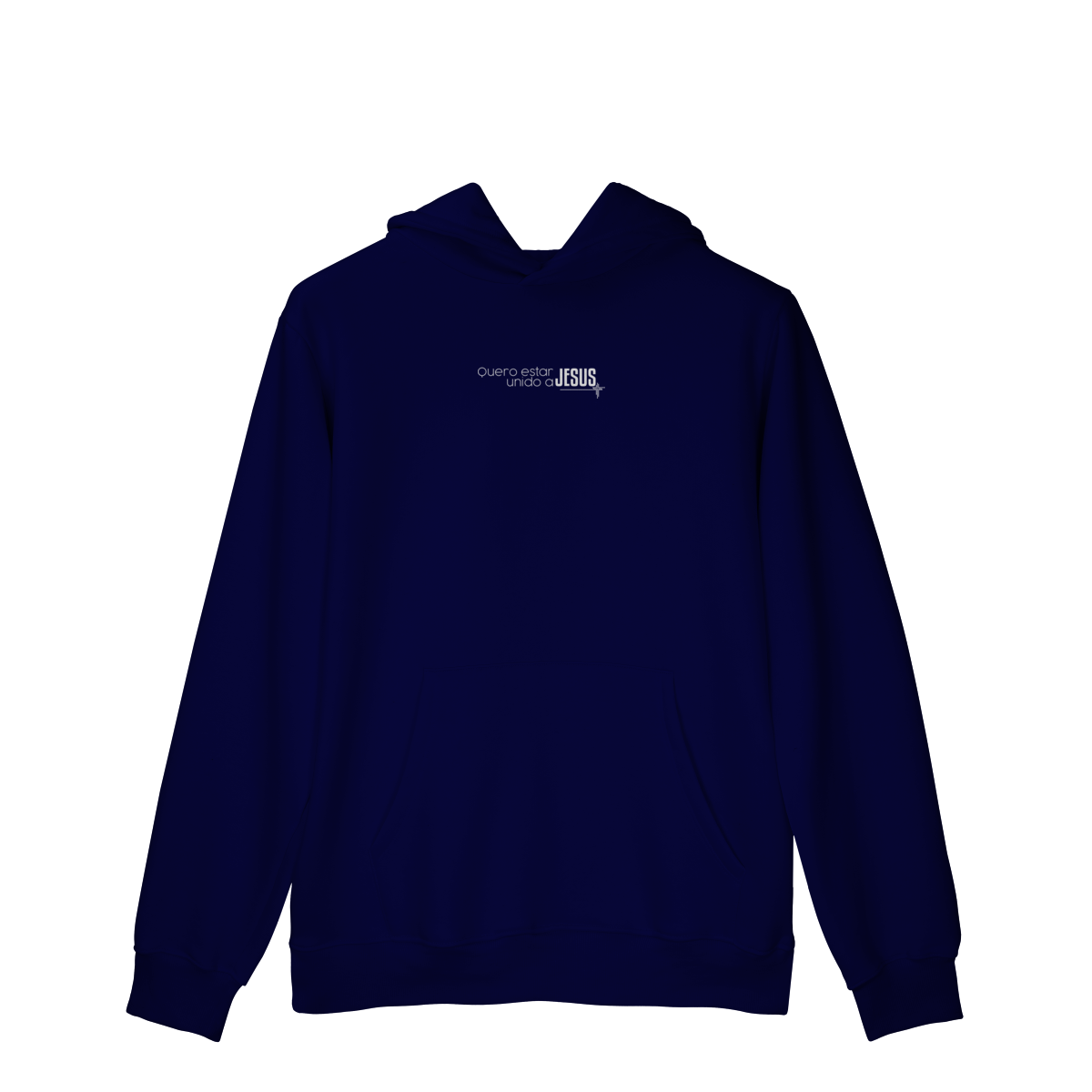 Na frente, a estampa delicada traz a frase “Quero estar unido a Jesus”, um convite à espiritualidade no cotidiano.